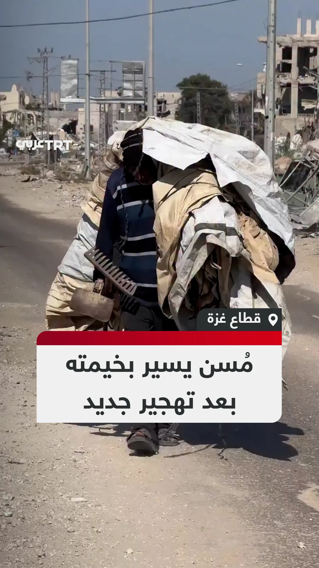 بعد أوامر تهجير من الاحتلال.. مُسن فلسطيني يحمل خيمته فوق رأسه ويسير في رحلة نزوح جديدة بحثاً عن مكان يقيم فيه داخل غزة